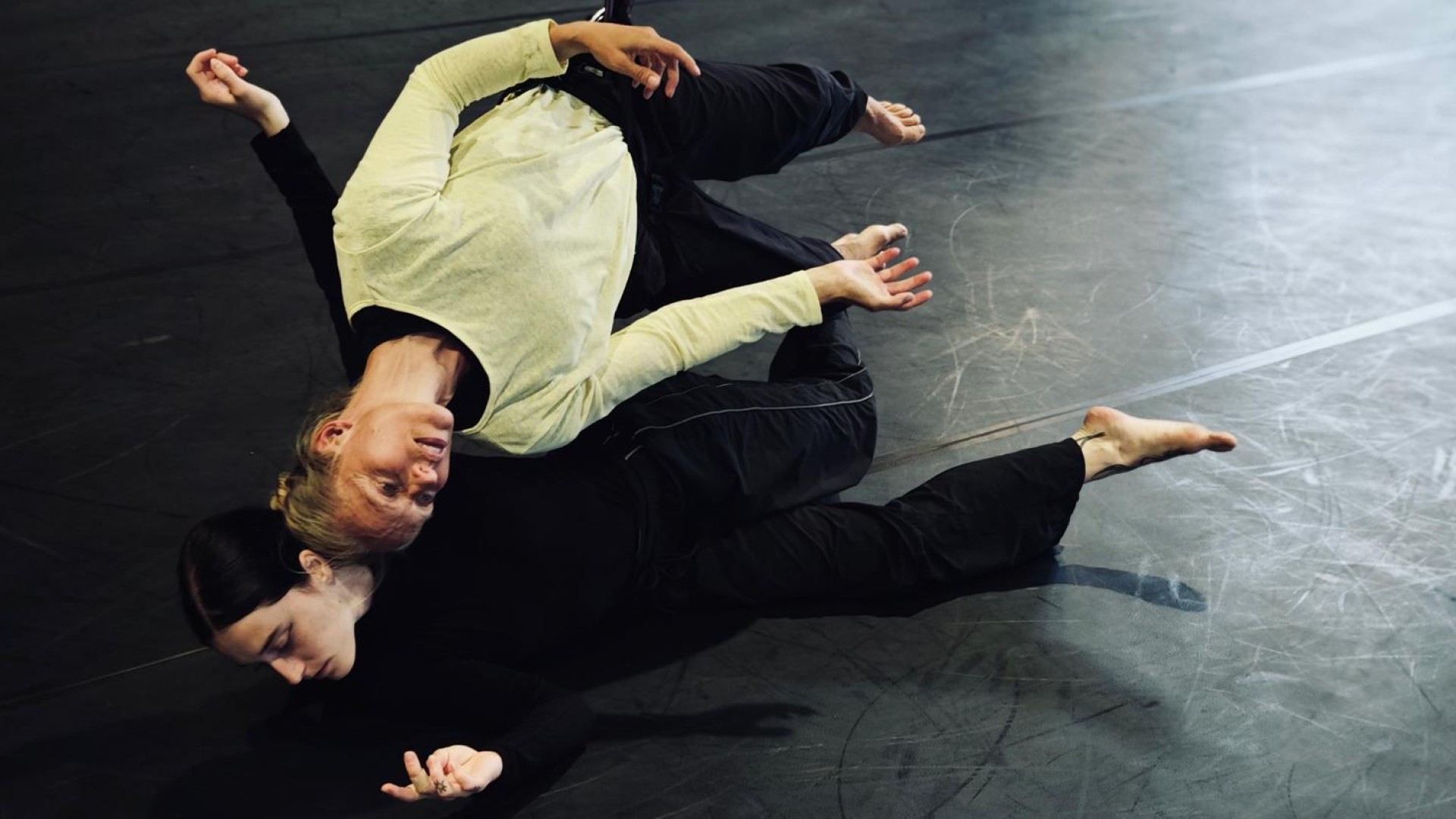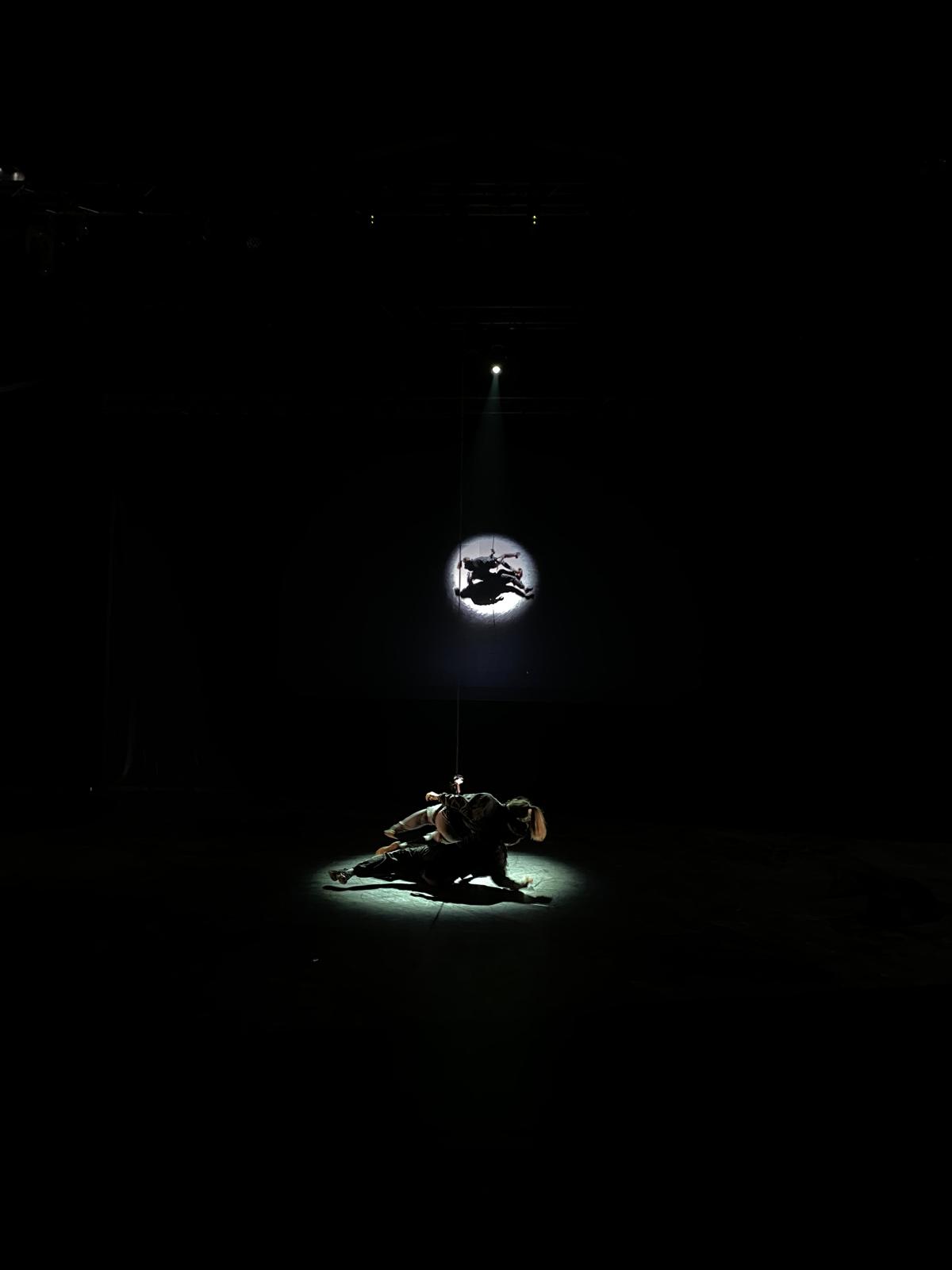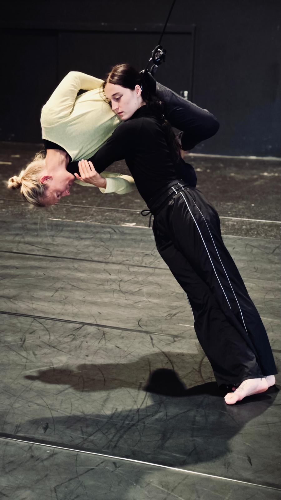Last September I had the pleasure of stepping out of the 'director's chair' and back into the harness when I started rehearsing for Lisa Lareida's new aerial dance duet, Orbit. The first few rehearsals are always a joy, to be able to fly, spin and swing freely off the floor. But as always, aerial dance demands a lot of the body. But what made the physical demands enjoyable this time, was having Lisa's suggestions from the outside and Joana's fast understanding of how to work with a rope. There is always a large gap between how moving through space is observed and how it feels proprioceptively. The three of us were often surprised by what we found together. The whole performance is filmed from above and projected live as we dance, offering us and the audience new perceptions. Orbit will be performed in the Grosse Halle on Friday 27 & Sunday 29 March 2026.